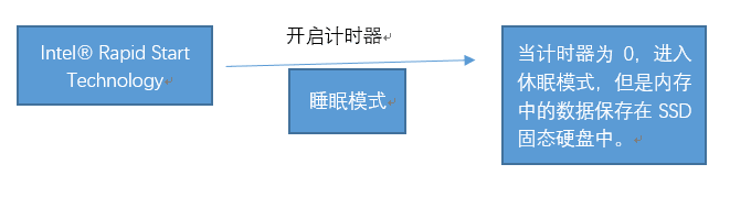 使用 Intel rapid start technology 之后,计算机选择睡眠模式后,会在设定的时间内由睡眠状态转为特殊的低功耗状态(即休眠模式),但数据会保存到 SSD 固态硬盘的休眠分区中,然后下次开机时读取 SSD 中的数据。此时计算机的功耗相当于休眠的功耗,而唤醒的速度相当于睡眠,所以称之为快速唤醒技术。