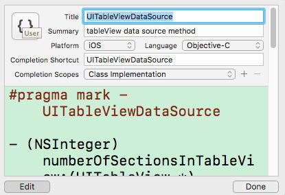 把 UITableView 委托协议的两个实现方法加入代码片段库: