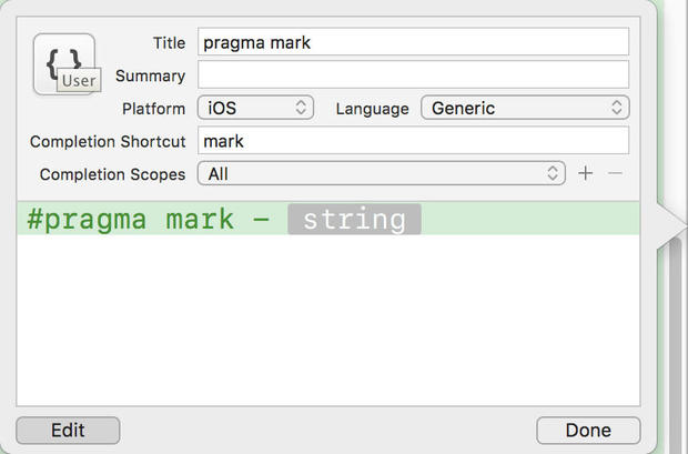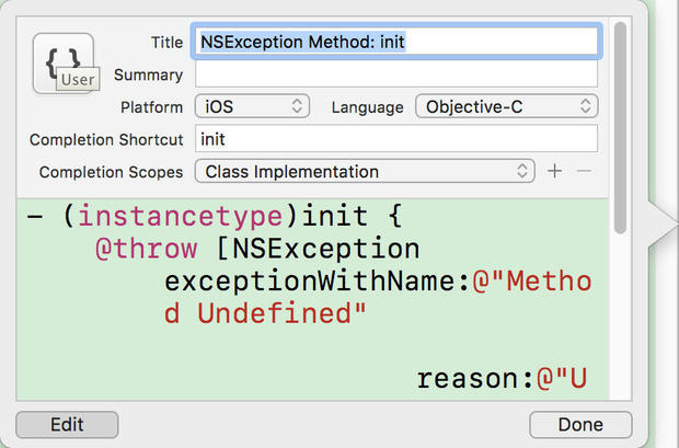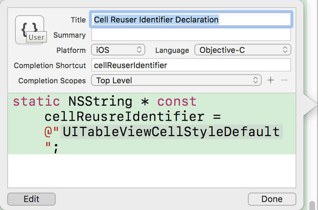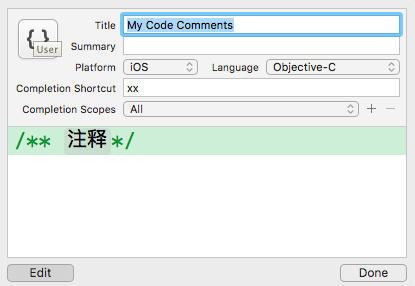| Completion Shortcut | 代码片段的触发字符串(在源代码文件中输入该字符串后,会触发 Xcode 自动加入相应的代码片段) |