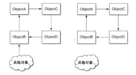 解决方法:弱引用(weak reference)、从外界命令循环中的某个对象不再保留另外一个对象。