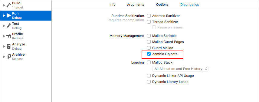 ❇️位置:Xcode 菜单栏 → Product → Scheme → Edit Scheme → Run → Diagnostics 诊断选项 → Memory Management → 勾选 Zombie Objects。