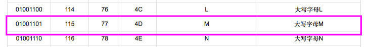 M 的 ASCII 编码 十进制为 77 ,二进制为 01001101: