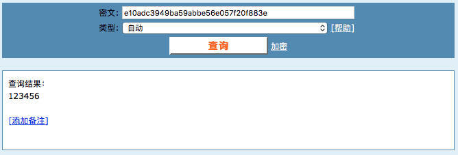 将刚才 123456 加密后的 MD5 输入,可以反向查询出原始数据: