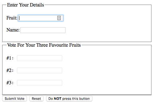 :hexoPostRenderEscape–><!DOCTYPE html> <html> <head> <title>Example</title> <meta charset="utf-8"> <meta name="author" content="Andy"> <meta name="description" content="A simple example of form"> <link rel="shortcut icon" type="image/x-icon" href="favico.ico"> </head> <body> <form method="post" action="http://titan:8080/form"> <p> <label for="name"> <!--maxlength: 用户能够输入字符的最大数目。浏览器可以自行确定文本框宽度。-->Name: <span class="token tag"><span class="token tag"><span class="token punctuation"><</span>input</span> <span class="token attr-name">maxlength</span><span class="token attr-value"><span class="token punctuation attr-equals">=</span><span class="token punctuation">"</span>10<span class="token punctuation">"</span></span> <span class="token attr-name">id</span><span class="token attr-value"><span class="token punctuation attr-equals">=</span><span class="token punctuation">"</span>name<span class="token punctuation">"</span></span> <span class="token attr-name">name</span><span class="token attr-value"><span class="token punctuation attr-equals">=</span><span class="token punctuation">"</span>name<span class="token punctuation">"</span></span><span class="token punctuation">></span></span> <span class="token tag"><span class="token tag"><span class="token punctuation"></</span>label</span><span class="token punctuation">></span></span> <span class="token tag"><span class="token tag"><span class="token punctuation"></</span>p</span><span class="token punctuation">></span></span> <span class="token tag"><span class="token tag"><span class="token punctuation"><</span>p</span><span class="token punctuation">></span></span> <span class="token comment"><!--size: 文本框能够显示的字符数目。不会限制用户输入字符数--></span> <span class="token tag"><span class="token tag"><span class="token punctuation"><</span>label</span> <span class="token attr-name">for</span><span class="token attr-value"><span class="token punctuation attr-equals">=</span><span class="token punctuation">"</span>city<span class="token punctuation">"</span></span><span class="token punctuation">></span></span> City: <span class="token tag"><span class="token tag"><span class="token punctuation"><</span>input</span> <span class="token attr-name">size</span><span class="token attr-value"><span class="token punctuation attr-equals">=</span><span class="token punctuation">"</span>10<span class="token punctuation">"</span></span> <span class="token attr-name">id</span><span class="token attr-value"><span class="token punctuation attr-equals">=</span><span class="token punctuation">"</span>city<span class="token punctuation">"</span></span> <span class="token attr-name">name</span><span class="token attr-value"><span class="token punctuation attr-equals">=</span><span class="token punctuation">"</span>city<span class="token punctuation">"</span></span><span class="token punctuation">></span></span> <span class="token tag"><span class="token tag"><span class="token punctuation"></</span>label</span><span class="token punctuation">></span></span> <span class="token tag"><span class="token tag"><span class="token punctuation"></</span>p</span><span class="token punctuation">></span></span> <span class="token tag"><span class="token tag"><span class="token punctuation"><</span>p</span><span class="token punctuation">></span></span> <span class="token tag"><span class="token tag"><span class="token punctuation"><</span>label</span> <span class="token attr-name">for</span><span class="token attr-value"><span class="token punctuation attr-equals">=</span><span class="token punctuation">"</span>fave<span class="token punctuation">"</span></span><span class="token punctuation">></span></span> Ff=ruit: <span class="token tag"><span class="token tag"><span class="token punctuation"><</span>input</span> <span class="token attr-name">maxlength</span><span class="token attr-value"><span class="token punctuation attr-equals">=</span><span class="token punctuation">"</span>10<span class="token punctuation">"</span></span> <span class="token attr-name">size</span><span class="token attr-value"><span class="token punctuation attr-equals">=</span><span class="token punctuation">"</span>10<span class="token punctuation">"</span></span> <span class="token attr-name">name</span><span class="token attr-value"><span class="token punctuation attr-equals">=</span><span class="token punctuation">"</span>fave<span class="token punctuation">"</span></span><span class="token punctuation">></span></span> <span class="token tag"><span class="token tag"><span class="token punctuation"></</span>label</span><span class="token punctuation">></span></span> <span class="token tag"><span class="token tag"><span class="token punctuation"></</span>p</span><span class="token punctuation">></span></span> <span class="token tag"><span class="token tag"><span class="token punctuation"></</span>form</span><span class="token punctuation">></span></span>