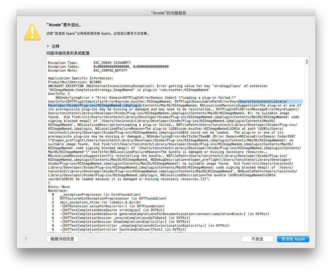 解决方法:查看意外退出报告,Finder 前往 plug-ins 目录,删除相关文件(KSImageNamed.ideplugin)。